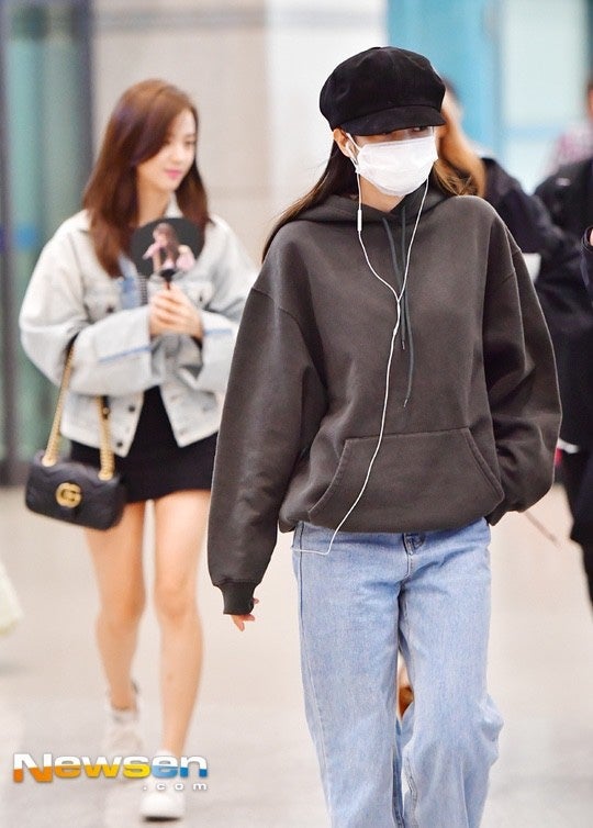 제니의 공항룩, 캐주얼한 패션, 로우 클래식 티셔츠, 산쿠안즈 팬츠, 치미, 선글라스로 자연스러운 룩의 끝!