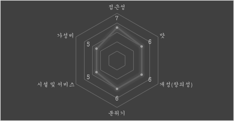 | 접근성 | 맛 | 개성(창의성) | 대기 | 시설 및 서비스 | 가격 대비 가치 |